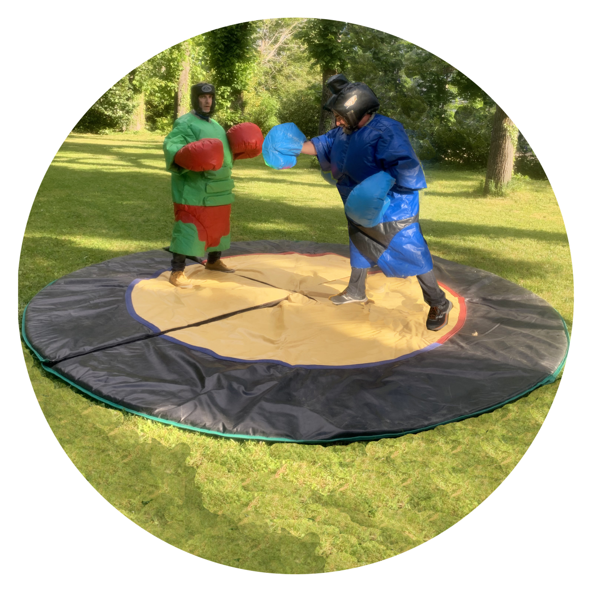 Costumes rembourrés avec casques et gants surdimentionnés.